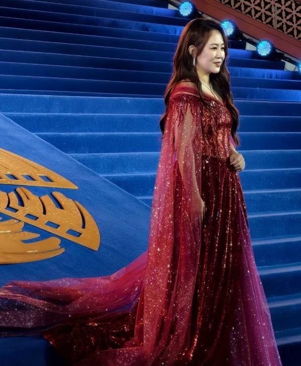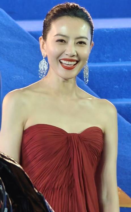 酒红色抹胸礼服,搭配大光明盘发的造型,一般人都难以驾驭,太考验明星的硬件条件和个人气质了。