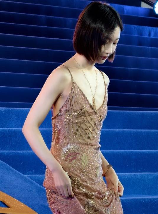 只是红毯上,她的审美还是一如既往,明明小身板极其单薄干瘪,非要穿修身的吊带连衣裙,一点曲线都没有。